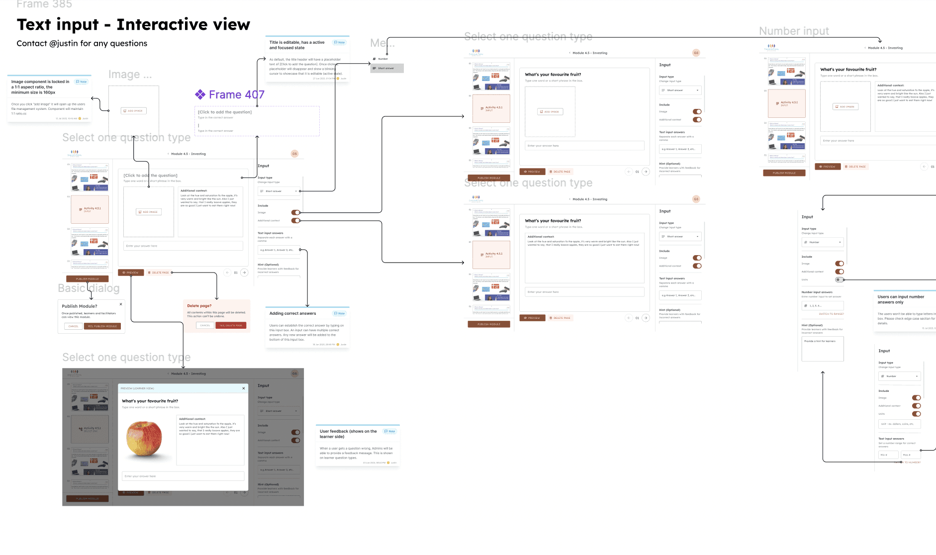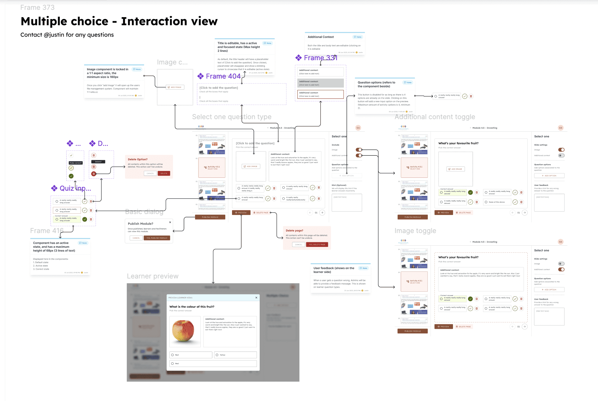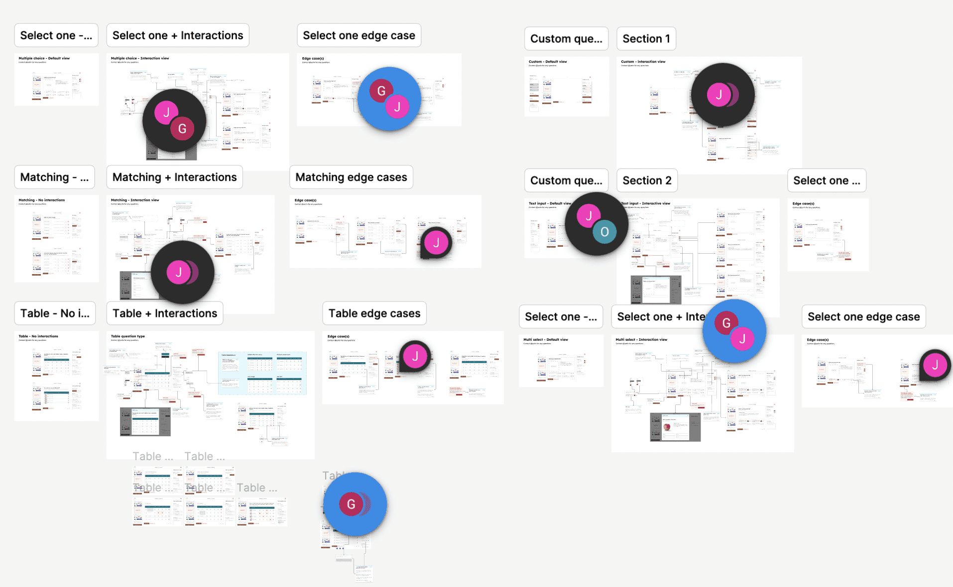 To ensure clarity for the developers, I broke each question type down into 3 sections. 1. No interaction view 2. Interaction view 3. Edge cases. This way the hand-off wouldnt be too cluttered.