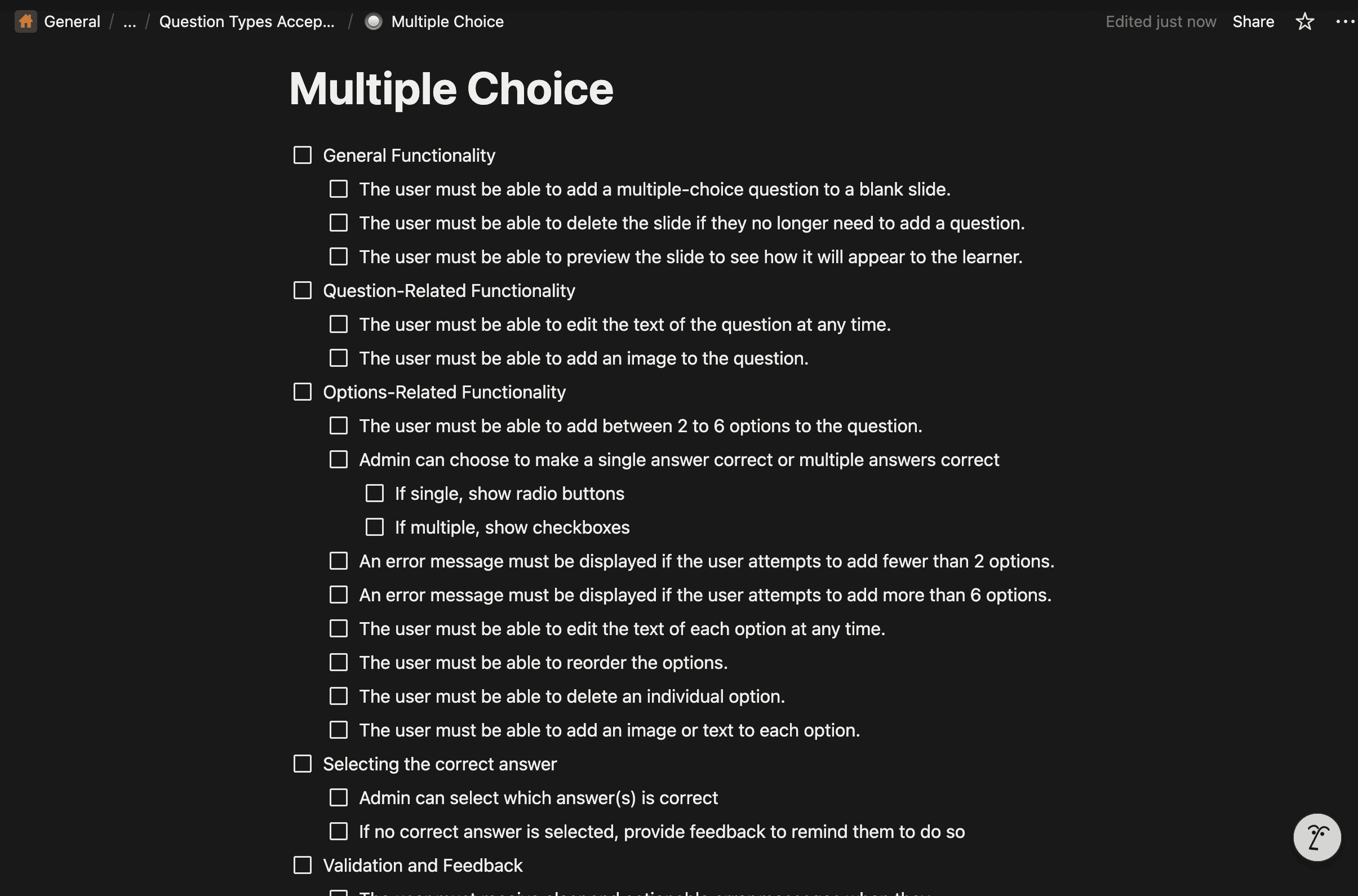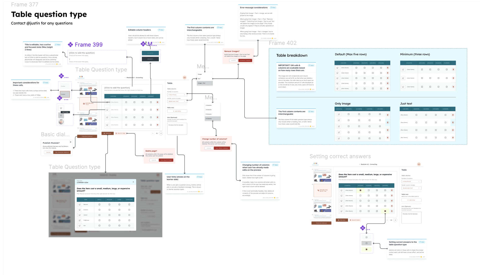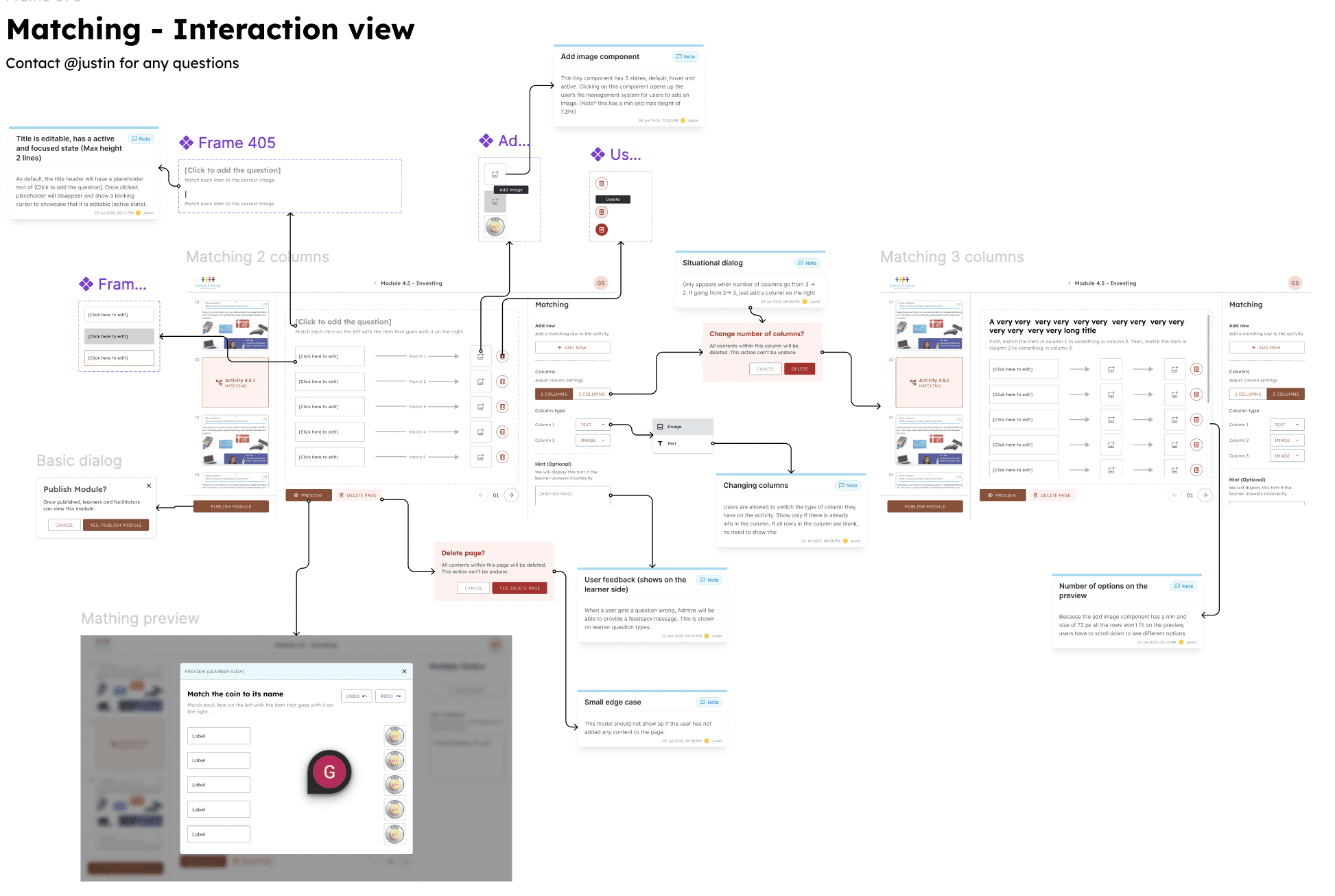 To ensure clarity for the developers, I broke each question type down into 3 sections. 1. No interaction view 2. Interaction view 3. Edge cases. This way the hand-off wouldnt be too cluttered.