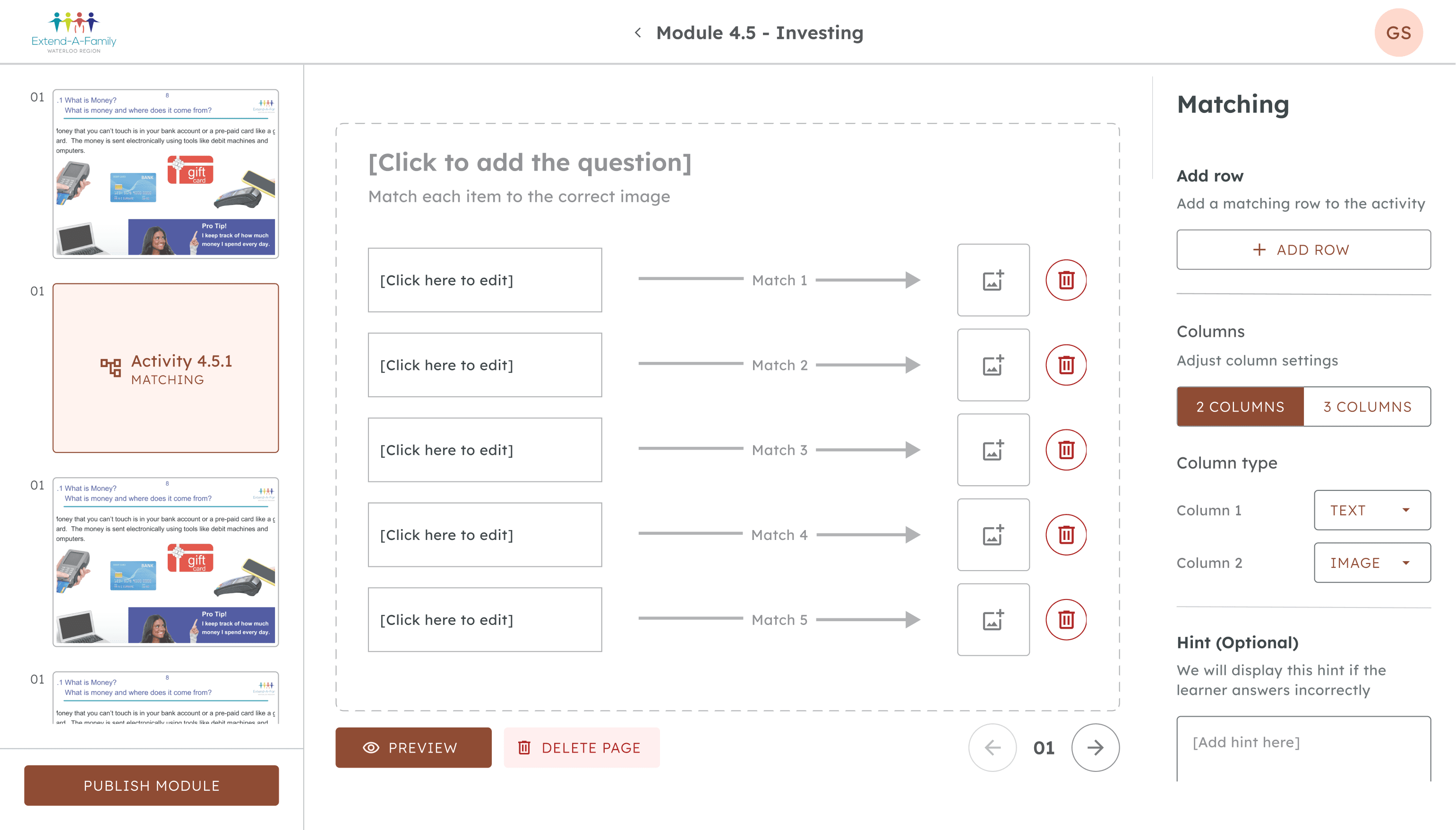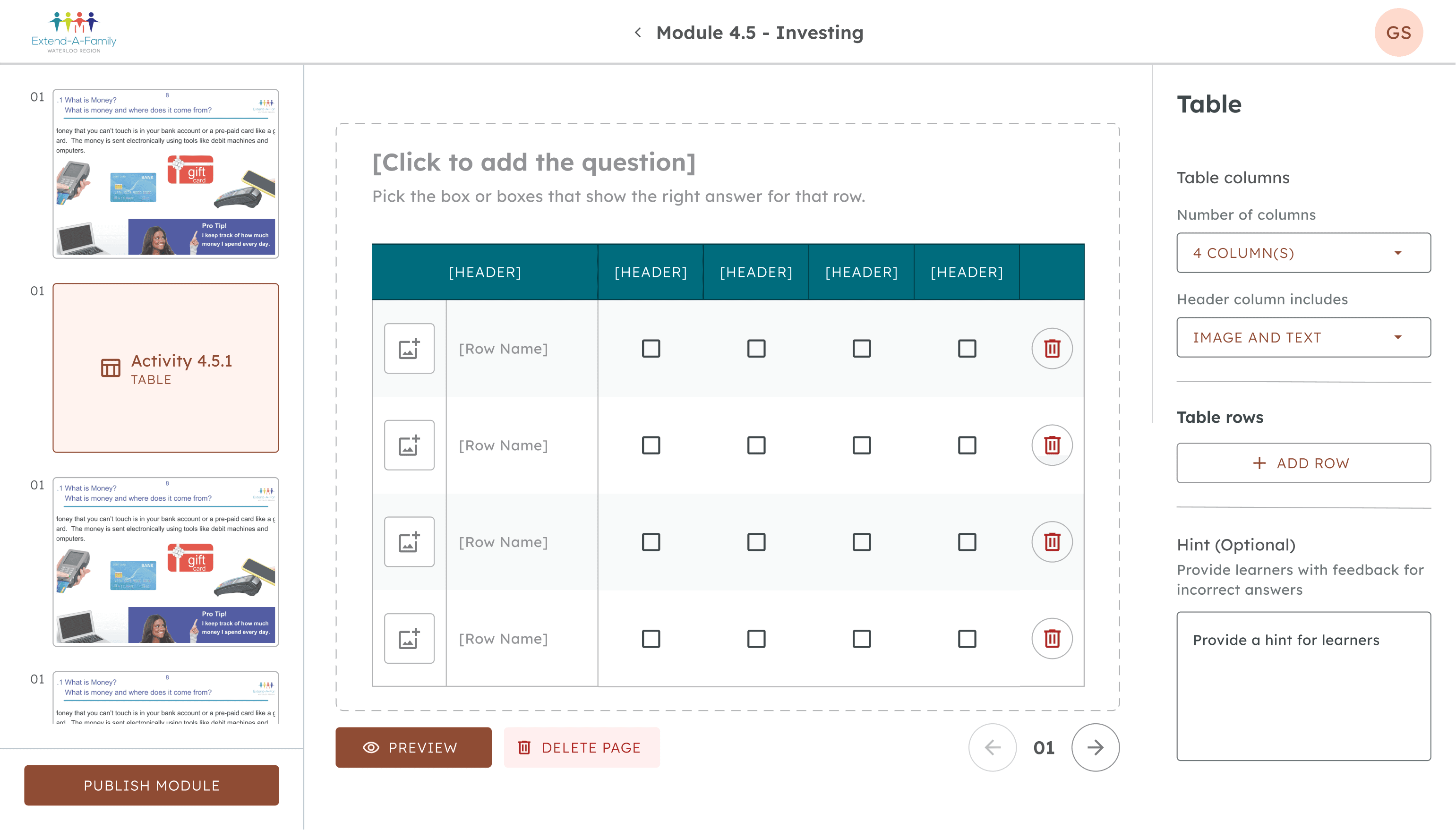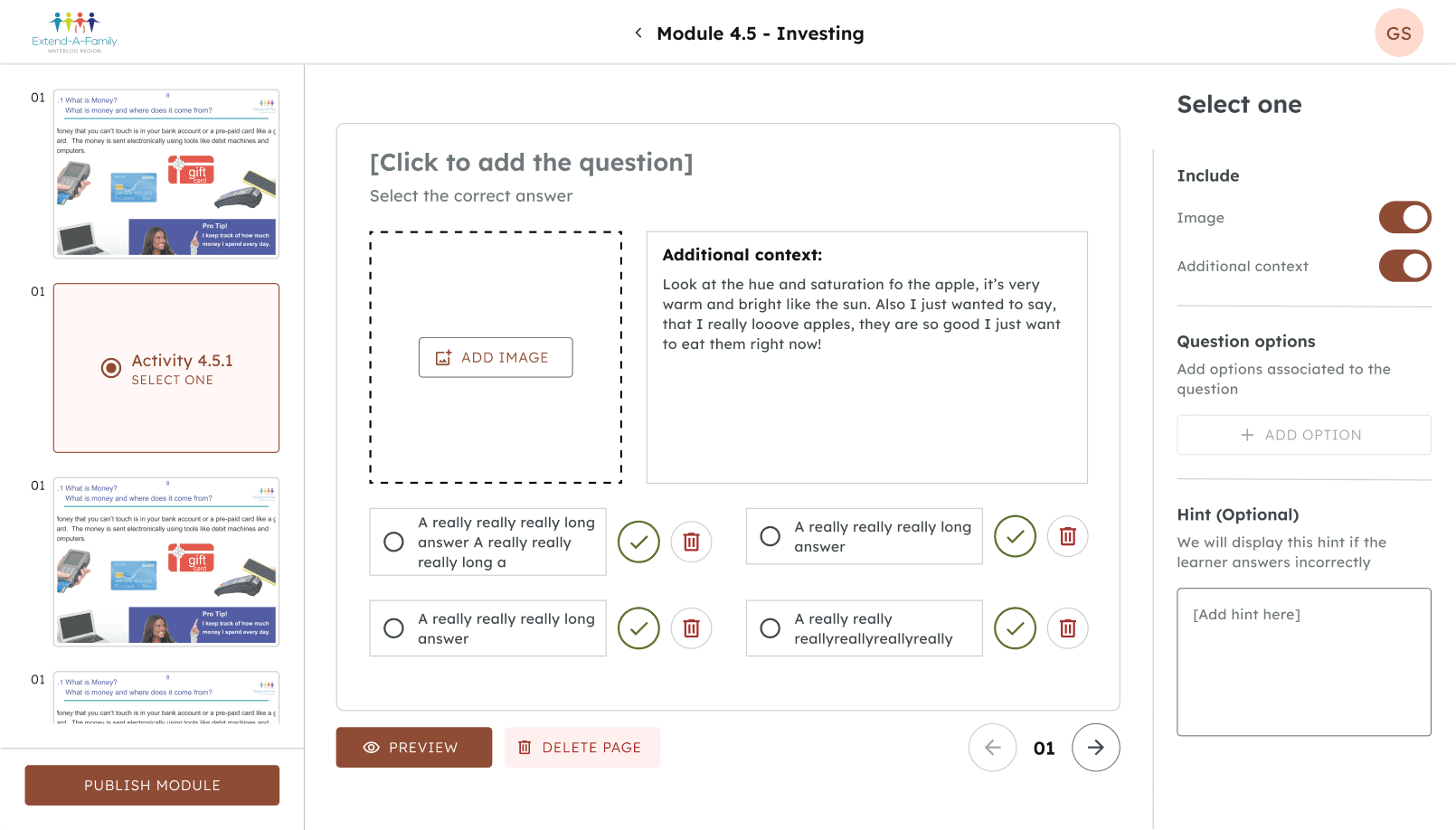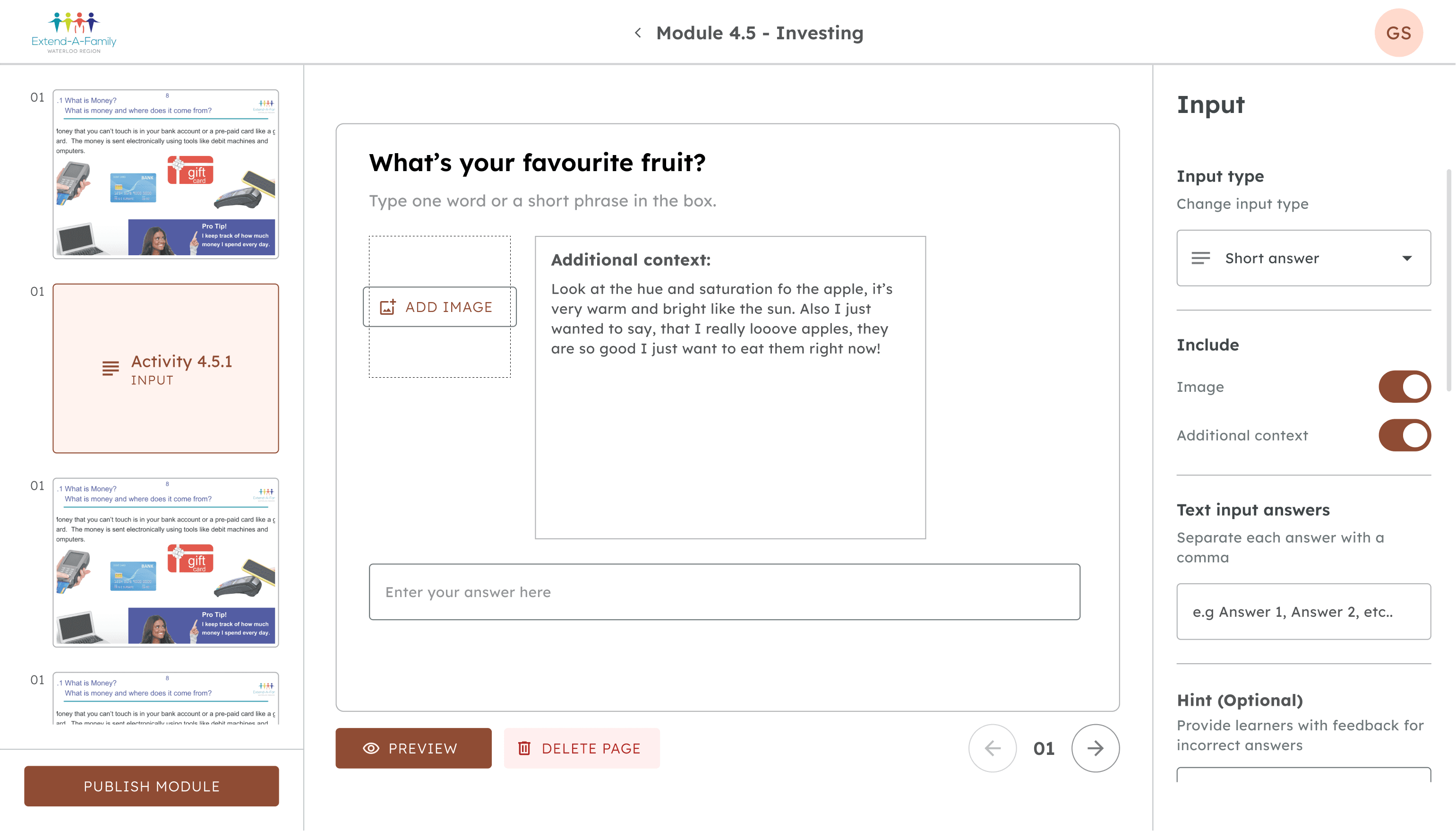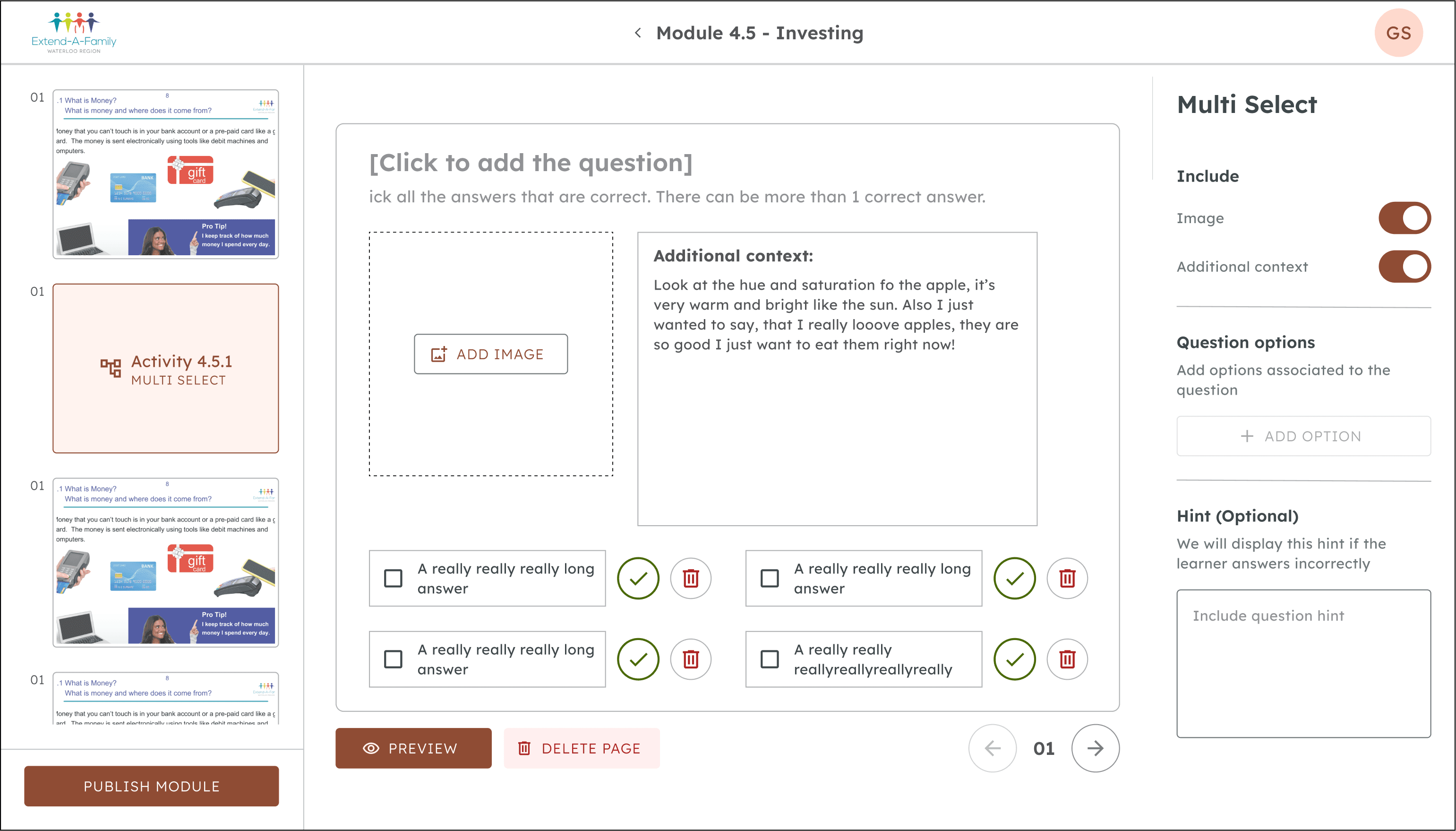 The team I'm a part of is called Extend-A-Family, a nonprofit that supports people with developmental disabilities through inclusive programs and services. Currently, we are helping Extend-A-Family build a financial literacy platform that will impact thousands of learners across Canada.