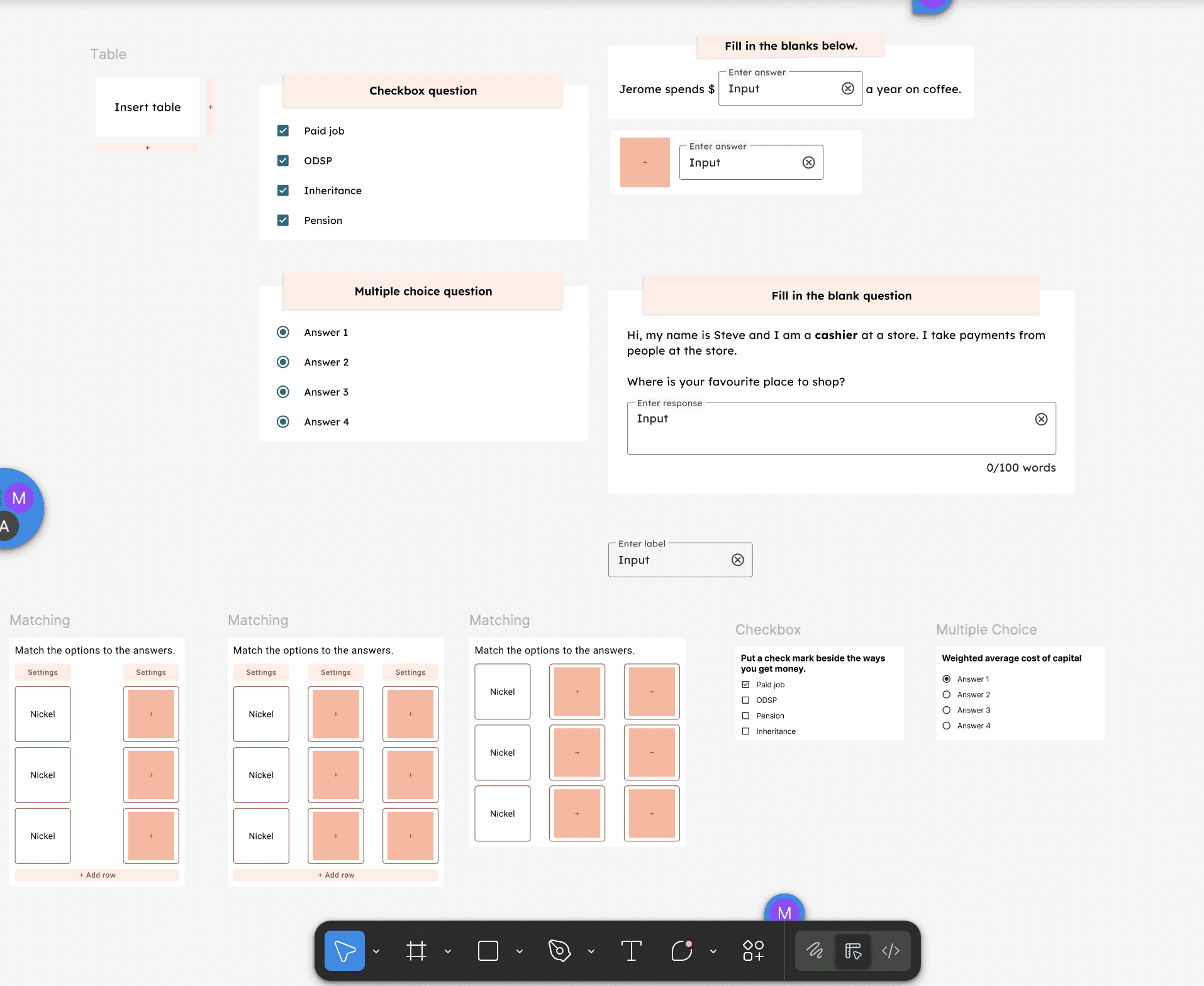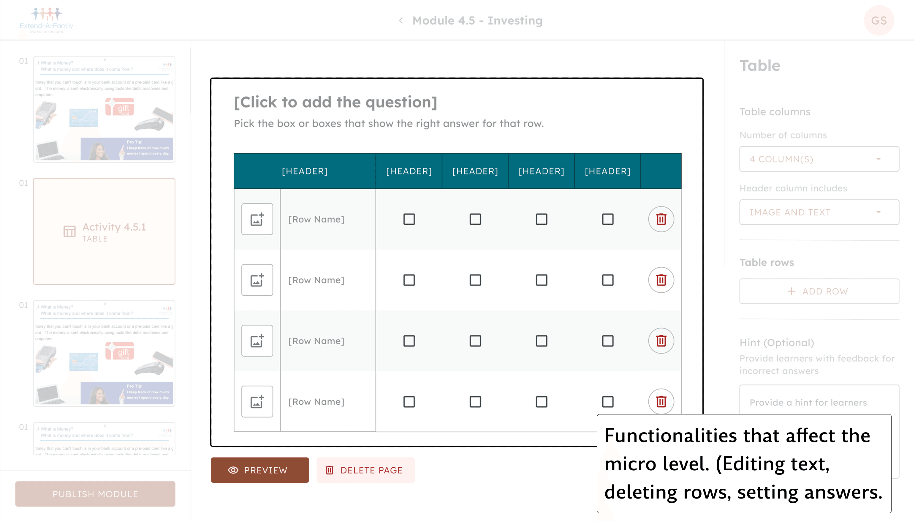 Through discussions with developers and PMs, I established that macro-related functionalities (# of rows/columns) were to be placed on the side panel and micro functionalities (editing text and answers) were placed on the preview.