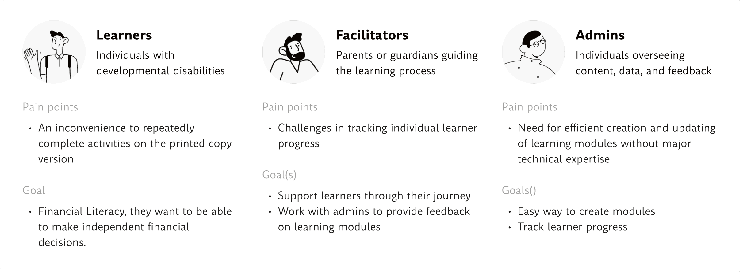 At Extend-A-Family, there are 3 main user groups: admins, learners, and facilitators. While the main user group I was designing for was admins, I still had to consider the other two user groups.